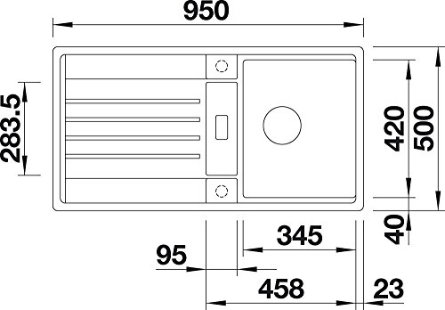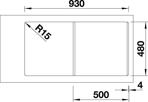 Für 50 cm breite Unterschränke – Beckentiefen 190/50 mm – Außen-Abmessungen 950 x 500 mm / Ausschnitt 930 x 480 mm – reversibel, d. h. Tropffläche kann nach rechts oder links ausgerichtet werden