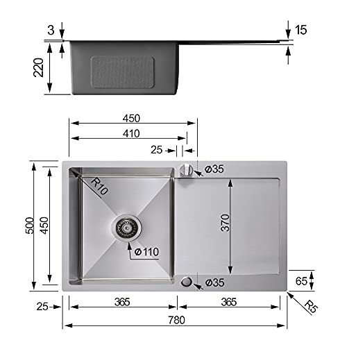 Specification: CECIPA Einbauspüle Edelstahl Eckig, Spüle Küche mit Abtropffläche und Ablauffernbedienung, Spülbecken 78×50 cm, Küchenspüle für ab 45er Unterschrank, inkl. Klappmatte, Siphon, Über- und Ablaufgarnitur