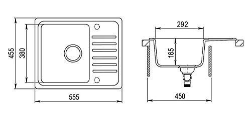 Masse: 555 mm x 455 mm, Tiefe des Beckens: 160 mm, Beckenmasse: 385 mm x 295 mm