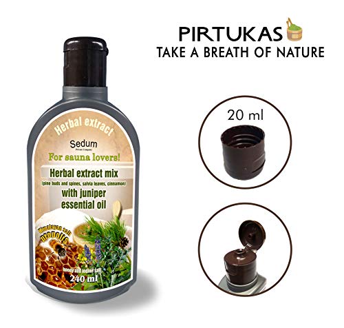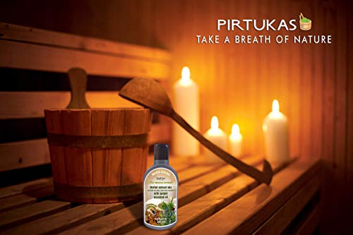 Specification: Pirtukas Natürlicher Saunaaufguss – Sauna-Öle für Sauna – Sauna-Aufguss Kräuterextraktmischung (Kiefernknospen und -nadeln, Salbeiblätter, Zimt) mit ätherischem Wacholderöl, Honig und Jodsalz – 240ml