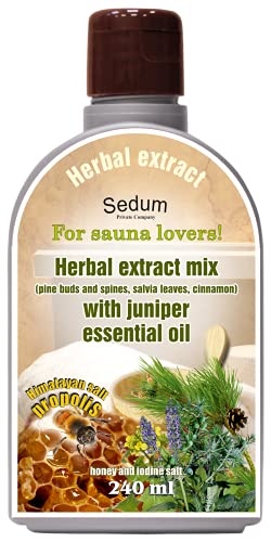Vielseitige Anwendungsmöglichkeiten: Kann in der Sauna als Lufterfrischer, zum Einweichen der Körperbürsten und für Massagen verwendet werden – Mischen Sie 45-50 ml (oder 2 Deckel) in 4 Liter heißes Wasser; für Hand- und Fußbad – mischen Sie 45-50 ml Extrakt mit heißem Wasser; Im normalen Badezimmer – mischen Sie 45-50 ml Extrakt in Wasser. 90% Extrakt aus Kiefernknospen und -nadeln, Salbeiblätter- und Zimt-Extrakt mit Himalaya-Salz, Propolis, Honig, Jodsalz und 10% ätherischem Wacholderöl
