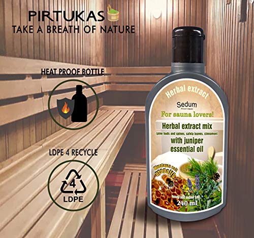 Pirtukas Natürlicher Saunaaufguss – Sauna-Öle für Sauna – Sauna-Aufguss Kräuterextraktmischung (Kiefernknospen und -nadeln, Salbeiblätter, Zimt) mit ätherischem Wacholderöl, Honig und Jodsalz – 240ml