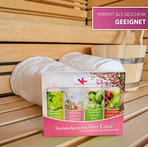 ✅ MADE IN GERMANY: Unser Sauna-Set ist Made in Germany. Bei der Herstellung des Saunaaufguss-Sets Altes Land war uns wichtig das für jeden etwas dabei ist, deshalb erhältst Du in einem Set vier verschiedene Duftsorten wie Tropic, Mango, Lemongras und Orange.